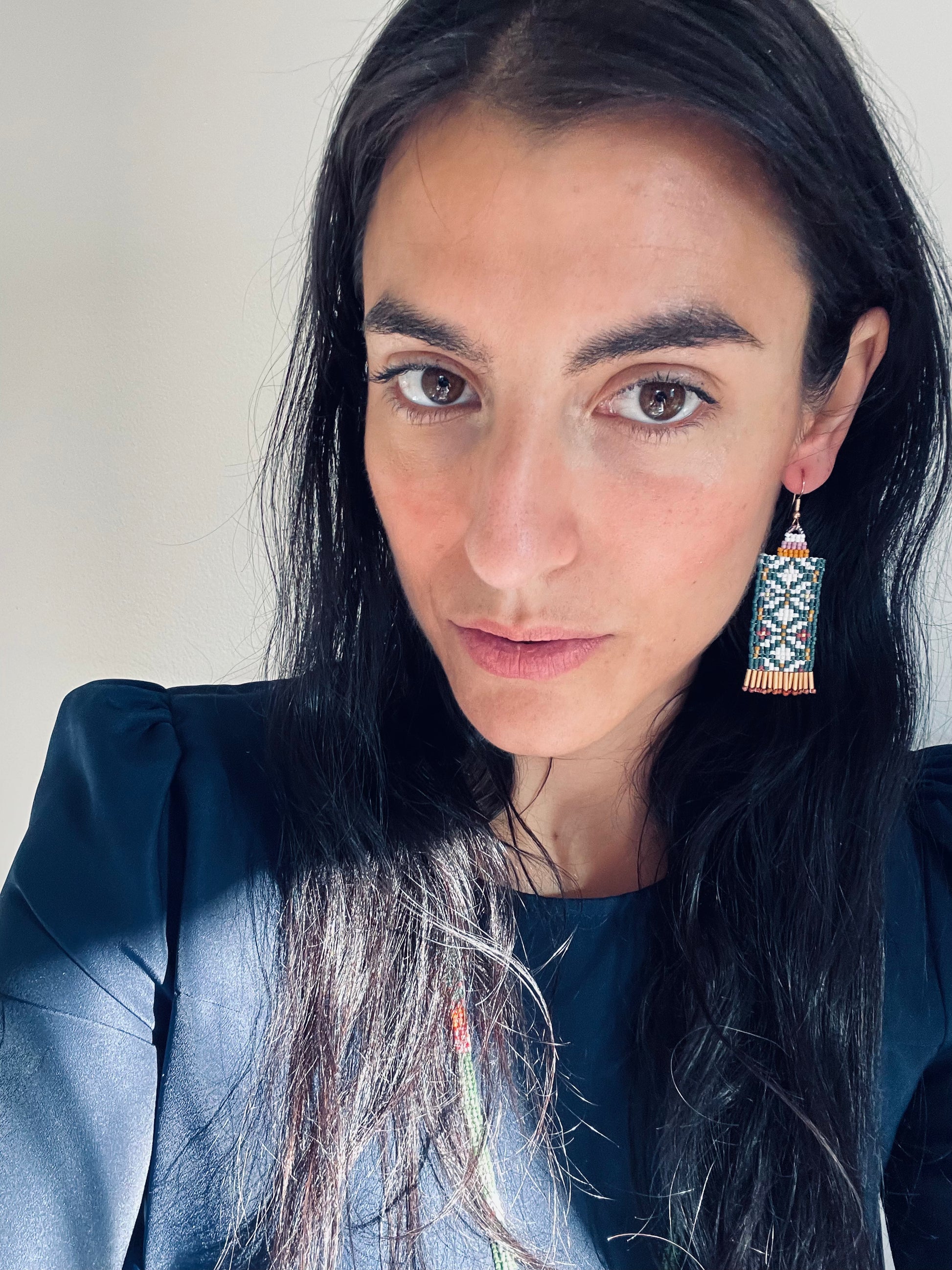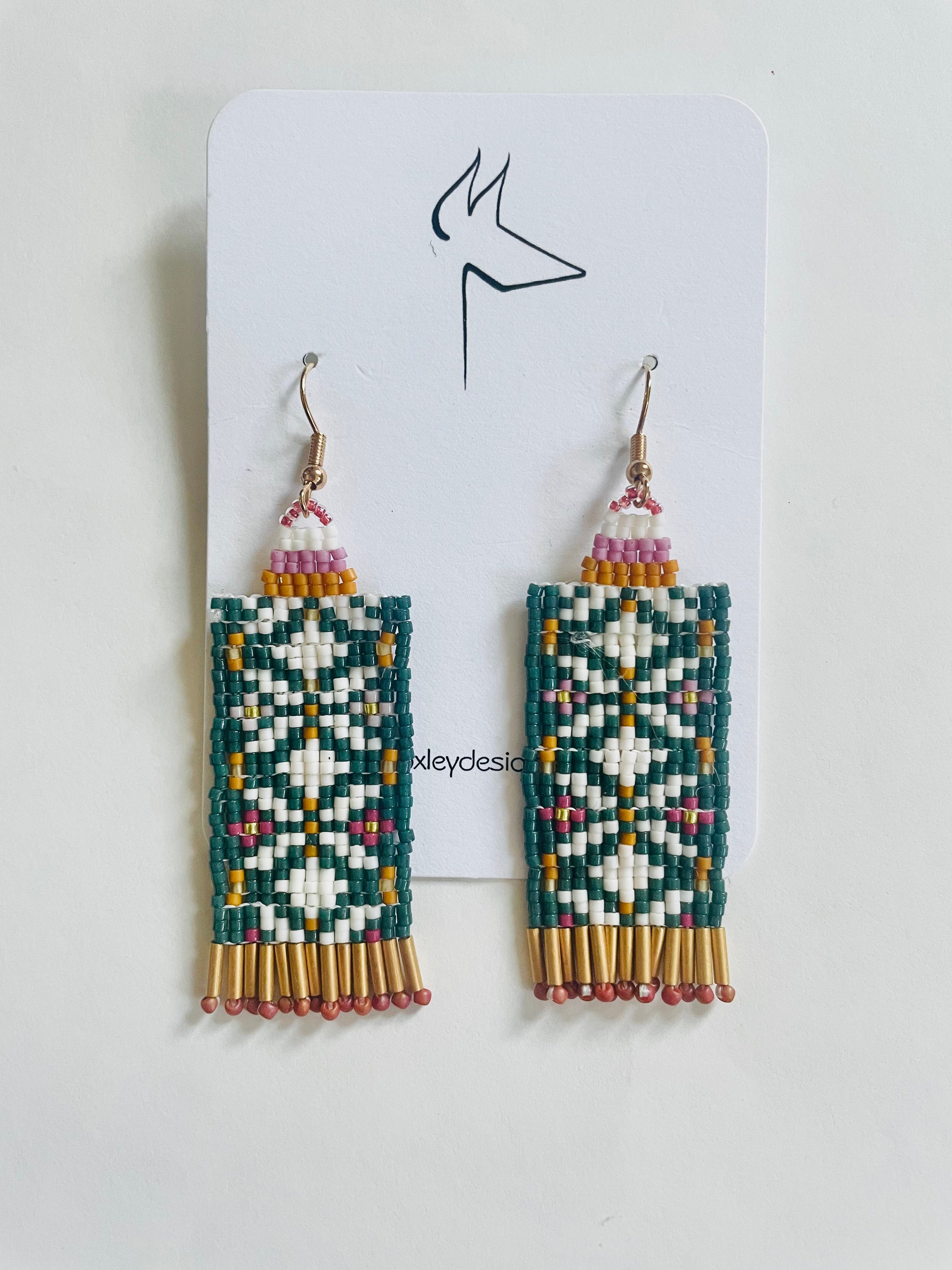 Forest Green snow white pattern, highlighted with sparkly gold plated miyuki glass beaded fringe.